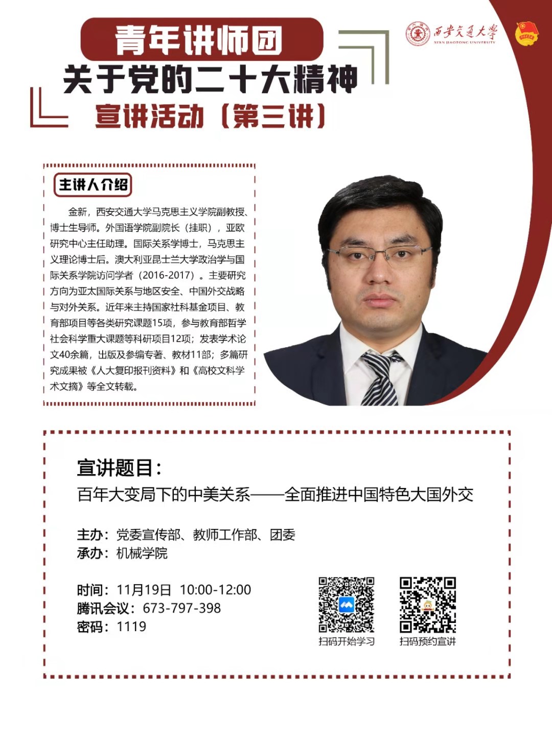 11月19日上午,av视频 党的二十大精神宣讲活动在线上举行。学院本科生、研究生党支部书记、委员,学院党建办成员、力行宣讲团成员等240余人参加活动。学校青年讲师团讲师、马克思主义学院副教授、博士生导师作“...