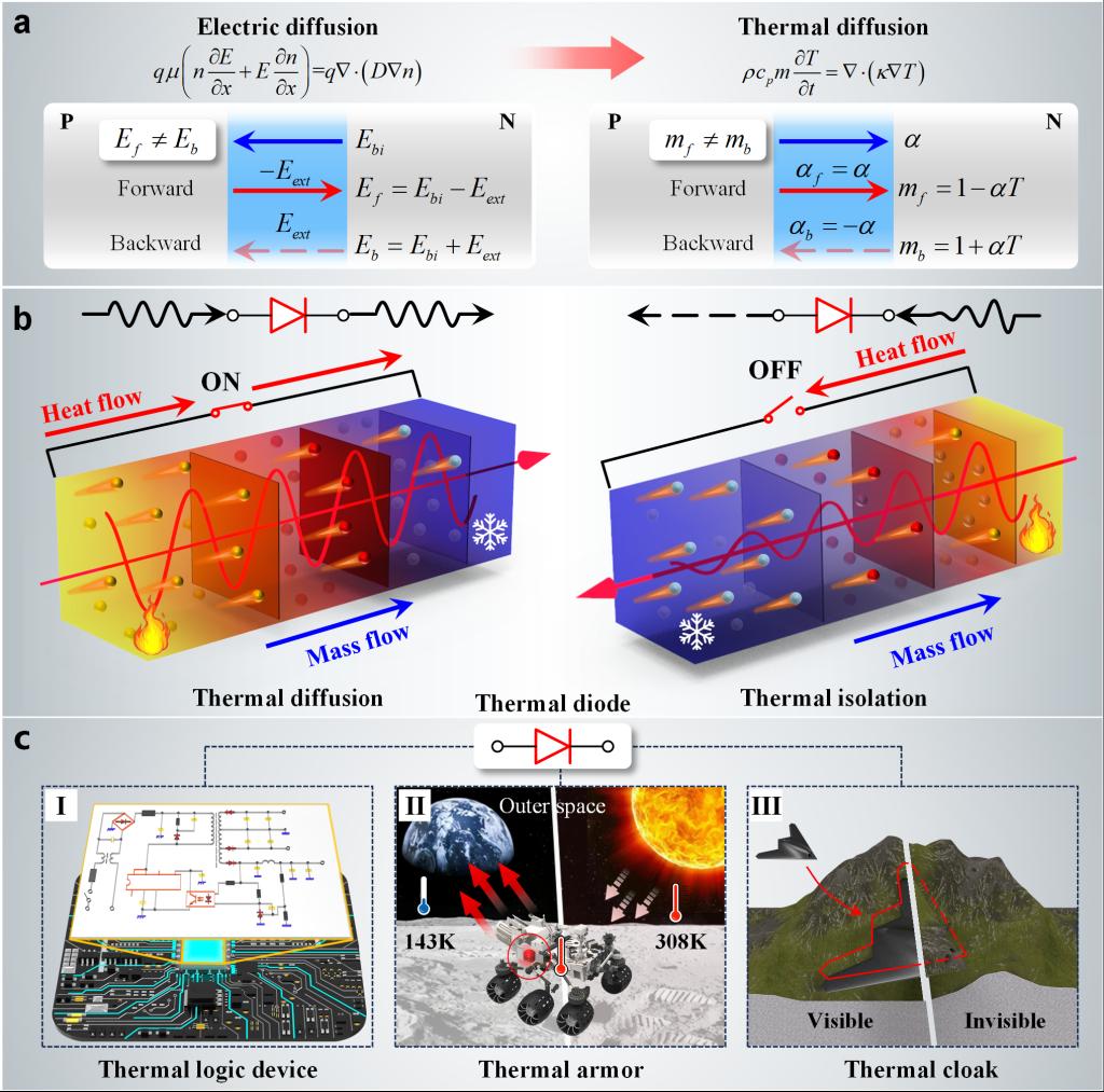 随着高功率密度装备(如高能武器、高超声速飞行器等)的迅猛发展,传统热控系统已逼近物理极限。在此背景下,“热路由网”作为一种变革性技术构想应运而生,其核心在于将热量视为一种可编程资源,通过“智慧路由”与“精准管理”相结合的方式破解制约尖端装备发展的“热瓶颈”问题。在经典热传导理论中,热传递行为严格遵循傅里叶定律,即热流方向完全由温度梯度决定,呈现出高度的对称性与方向无关性。如何突破这种对称传热的...
