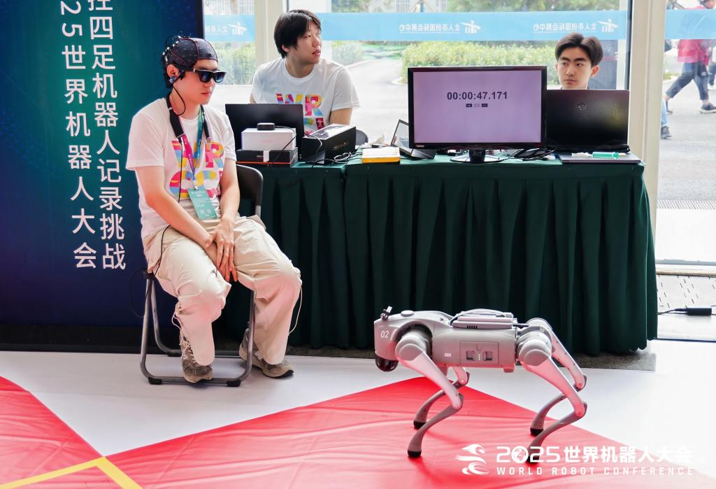选手张博思以4分27秒的成绩完成“8字形赛道”及握手等交互任务,达到手动操作速率的85%,标志着脑机接口技术在实际场景中完成复杂路径与交互任务的可行性不断提升,该成绩也被列入2025年度脑控四足机器人赛会纪录。