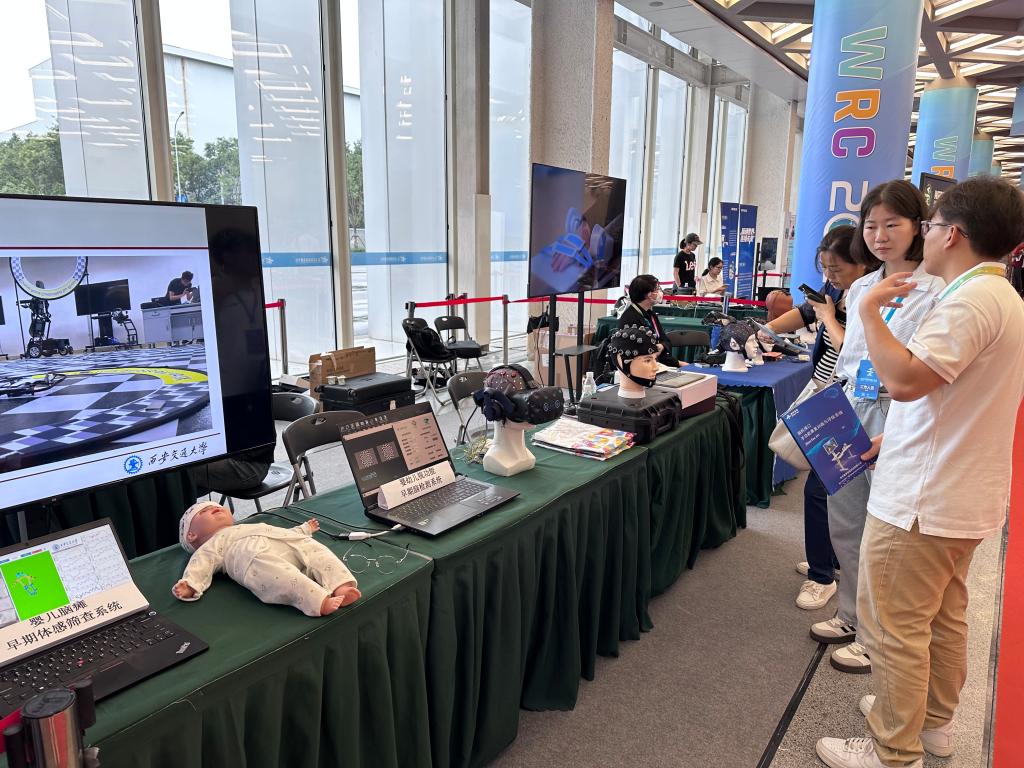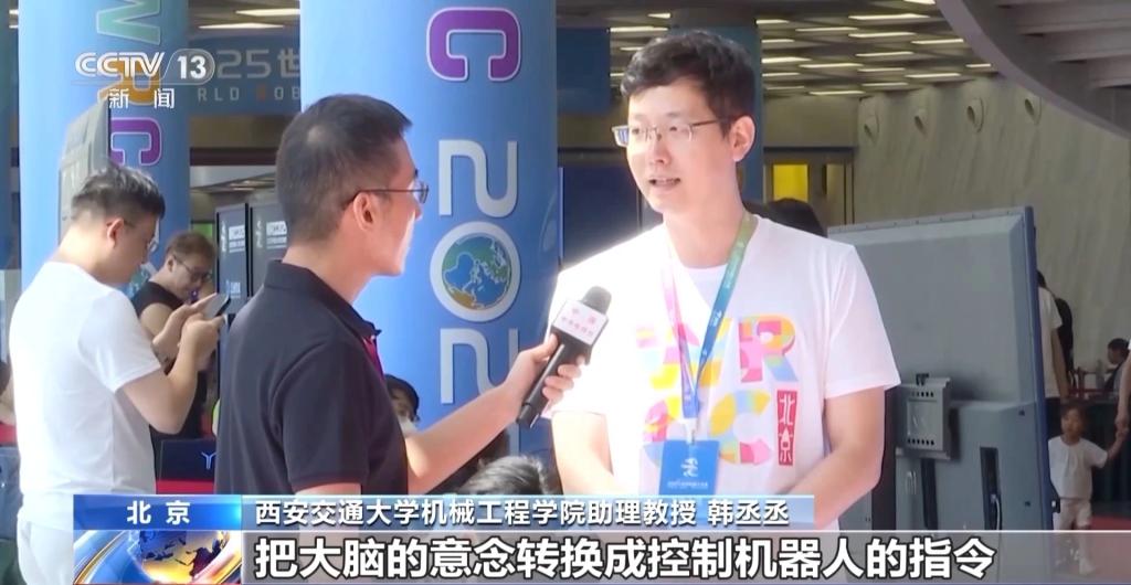 医工交叉研究所徐光华教授团队的婴儿脑瘫早期体感筛查系统、婴幼儿视功能早期脑检测系统、脑控手功能康复系统、智能导览机器人与脑控四足机器人等多项创新成果在大会亮相。这些前沿技术因其在医疗康复与智能交互领域的独特应用,受到现场参观者广泛关注,并吸引了央视、新华网等多家媒体报道,团队还接受了央视的专题采访,分享技术突破与未来发展方向。