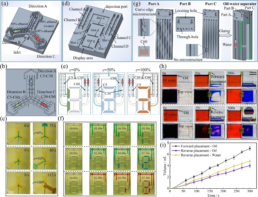 张辉副教授团队提出了基于最小作用原理(最小能量法)的高曲率弓形边缘设计方法,获得了不同条件下的最优阻碍弓形曲线,从能量角度揭示了弓形边缘对于液体在沟槽内的最大阻碍作用机理,并提出了不同接触角下弓形曲线设计方法与准则。该研究揭示了2016年以来学界未能解释的弓形结构对流体作用机理问题。基于上述理论,研究团队设计并构建了多种功能性微流控器件,包括Y型分支通道、流体数字显示器和油水分离器。其中,Y型分支通道能够利用接触角差异实现液体在支路间的选择性分流;流体数字显示器通过不同液体在不同通道中的路径走向,形成不同的数字图案显示;油水分离器依靠弓形边缘的润湿差异实现无外场高效油水分离,其5分钟分离效率可达约98%。该研究为微流控系统中液体的定向输运、多向调控及智能筛分提供了新的结构策略与设计思路。