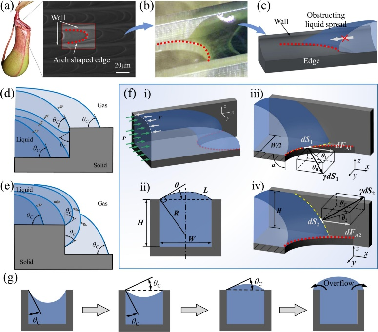 自2016年猪笼草口缘流体单向引导性被发现以来(Nature 2016, 532 (7597), 85),其表面独特的弓形盲孔微结构,一直是众多流体调控研究的热门仿生对象。然而,为什么猪笼草口缘表面微结构呈现弓形,近十年来科学界一直没有很好的解释。如何恰当地设计弓形弧度,实现流体高效引导甚至是选择性调控,对于理解毛细驱动、润湿能量转化及液体调控机理具有重要意义。