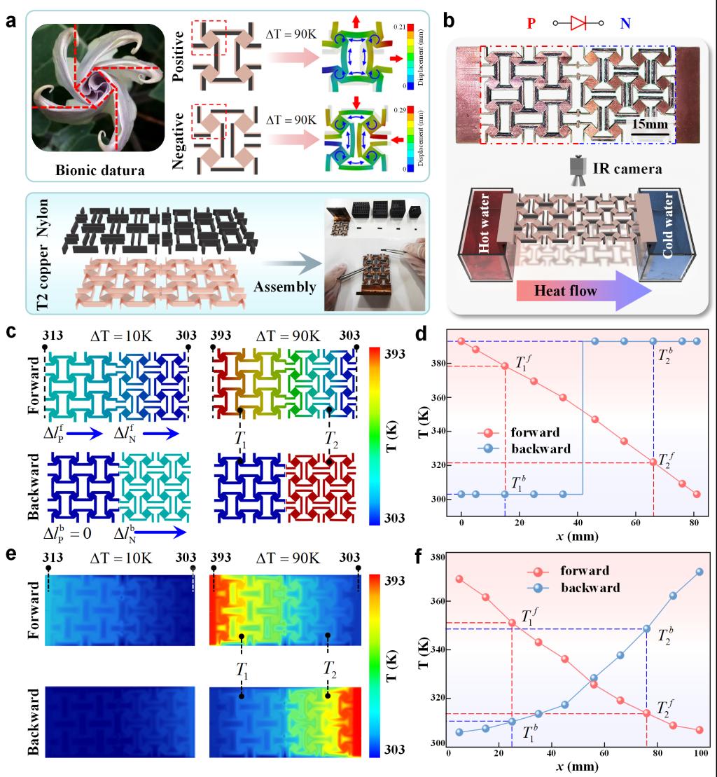 洪军教授、李宝童教授团队首创了基于异质材料协同热膨胀的“热p-n结”物理模型,通过构建定向质量场成功实现了宏观热二极管。该研究建立了热学系统中“定向质量场”与电学中“内置电场”的理论对应关系,揭示了正/负热膨胀材料协同作用下产生的净质量流对系统热导率分布的调控机制,从而打破热传递的空间反演对称性。基于此理论突破,团队受曼陀罗花螺旋生长启发,设计了具有四重旋转对称性的仿生手性超材料单元,将等效热膨胀系数提升至基体材料的7.7倍,并通过引入“可变域边界”,在303-393 K的宽温区内实现了理想热整流效应(整流比η=1)。基于该原理设计的热二极管展现出卓越的性能:在正向传热时,热流密度高达19232 W/m²,系统呈现高效导通状态;而在反向传热时,热流被抑制至接近零值,表现出近乎完美的阻断特性。该研究不仅解决了宏观尺度非互易热传递的实现难题,更为热逻辑器件、智能热防护装甲和热隐身技术等前沿应用提供了新的设计范式与解决方案。