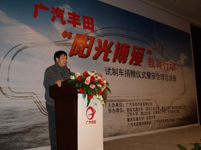 高建民院长代表受赠单位致辞,感谢丰田汽车公司对于高校教育事业的支持以及对车辆工程专业发展的支持,并称赞广汽丰田公司是承担社会责任的表率,他说,汽车制造集现代制造、电子、控制技术为一体,汽车的发展代表了现代高科技发展的水平,勉励在座的研究生以参加捐赠仪式为契机,更多了解高科技发展以及现代制造技术发展。