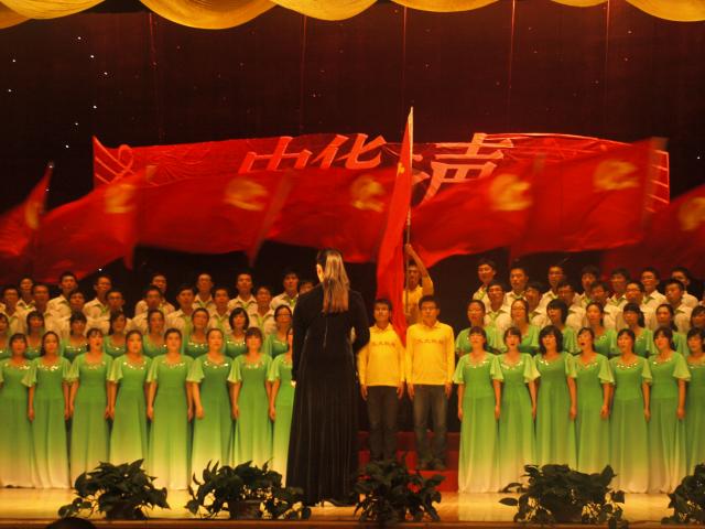 代表队由2011级的120位合唱队员和40位旗手组成,指挥由郝婕老师担任。同学们着装整齐,精神焕发,唱歌时而温婉柔情,时而慷慨激昂;指挥激情洋溢,铿锵有力;舞蹈动作到位,感情充沛;全场党旗飘动,人心振奋,整个演出精彩纷呈,美妙绝伦。av视频