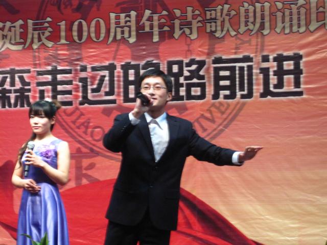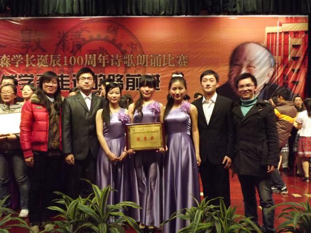 代表队由2011级研究生王佳、李杨、吴玲玲、张朝阳、马跃洋等五位同学组成,朗诵作品为周亮同学的原创诗歌——《长路行》。伴随着乐曲,同学们自信饱满,感情充沛,表演动作到位,朗诵时而温婉柔情,时而慷慨激昂。表演过程中,赢得了在场观众的阵阵掌声,并最终获得本次朗诵比赛优秀奖。