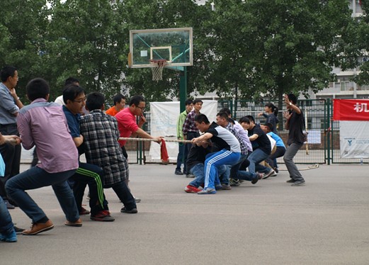 之后举行的是集体项目拔河比赛,与之前欢乐的比赛氛围不同,比赛的紧张气氛一时间达到顶峰。博士各队都牟足了劲,红色飘带总在白线上左右摇摆。拔河比赛过后是气氛更加欢乐的三人绑腿跑,因为不熟练等因素场上状况频出,伴随着参赛运动员姿态各异的摔倒动作,场上场下笑声不断。整个比赛在热烈、放松的气氛中圆满结束。