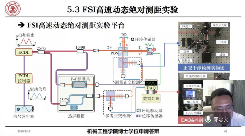 博士研究生孙岩辉和邓忠文分别进行了题为《精密转子系统装配精度分析与装配工艺优化方法研究》和《基于外腔半导体激光器的光频扫描干涉绝对测距方法研究》的报告,向答辩委员会各专家及与会师生汇报了自己的研究内容与研究成果。答辩委员会充分肯定了两位博士生的科研工作,同时也指出了不足之处,并就存在问题进行了提问。两位博士生认真回答了相关问题,听取了各位专家给出的意见和建议。