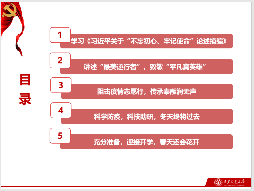 习主席在讲话中说到:“中华民族历史上经历过很多磨难,但从来没有被压垮过,而是愈挫愈勇,不断在磨难中成长、从磨难中奋起。”作为新时代的党员,作为交大的博士生,我们应当牢记使命初心,坚定理想信念,发扬“胸怀大局、无私奉献、弘扬传统、艰苦创业”的西迁精神, 与全党全军全国各族人民团结奋斗,战胜当前疫情,充分准备,迎接开学。发挥所学知识,为保持我国经济社会良好发展势头,实现决胜全面建成小康社会、决战脱贫攻坚的目标任务贡献自己的一份力。