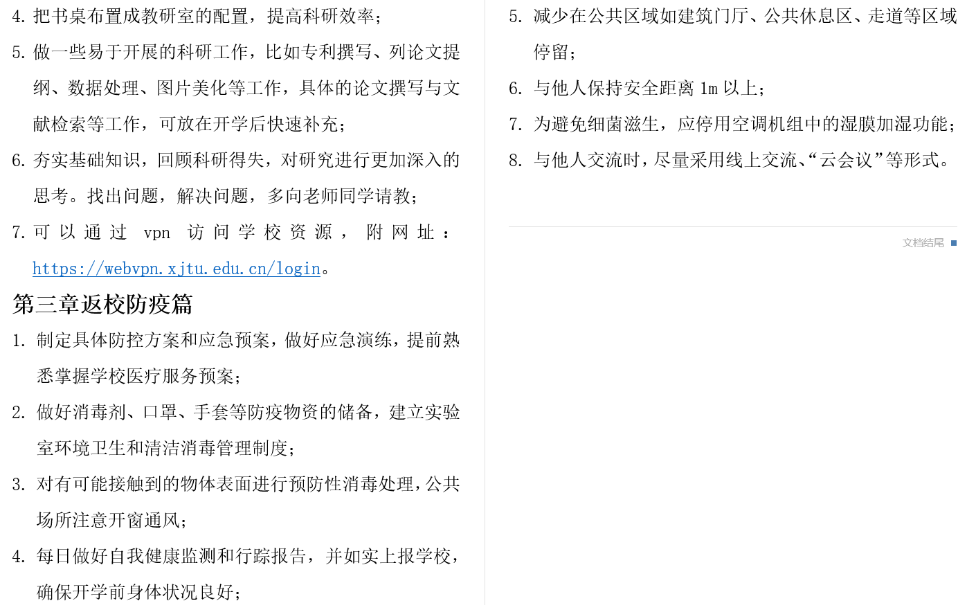 科学防疫,科技助研,冬天终将过去;充分准备,迎接开学,春天还会花开。防控疫情期间,同学们采取居家学习科研的方式,随着4月19日陕西省教育厅发布关于做好陕西高校2020年春季学期开学工作的通知,开学也终于被提上议程。关于返校前如何在家高效科研,以及如何安全返校并在返校后科学防疫,大家献计献策,分享防疫知识,并从返校前防疫、居家科研和返校后防疫整理成《科学防疫&居家科研手册》,期望通过党组织生活会,对同学们给予一定的帮助。
