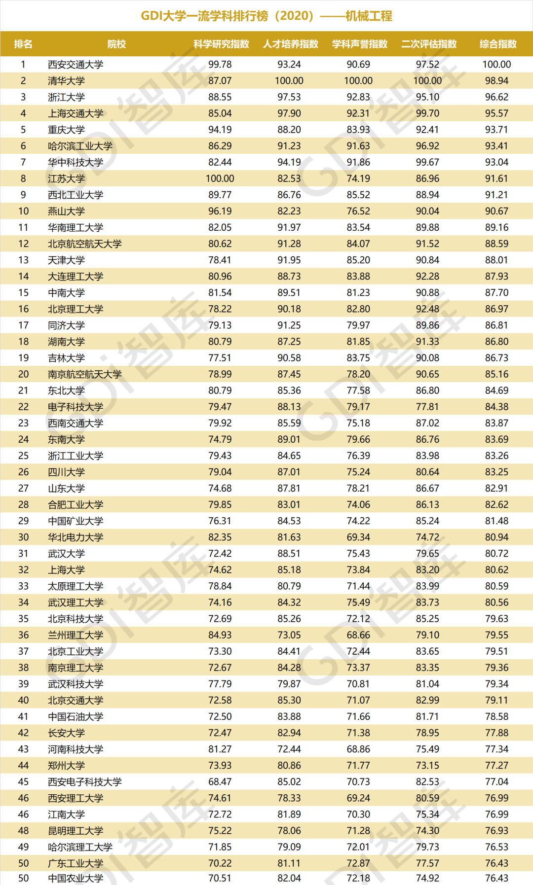 共有6个工程学科进入全国前5位,跨入“世界一流学科”,其中机械工程位列全国第1位,动力工程及工程热物理位列全国第2位,力学、核科学与技术、管理科学与工程位列全国第3位,电气工程位列全国第4位。榜单如下: