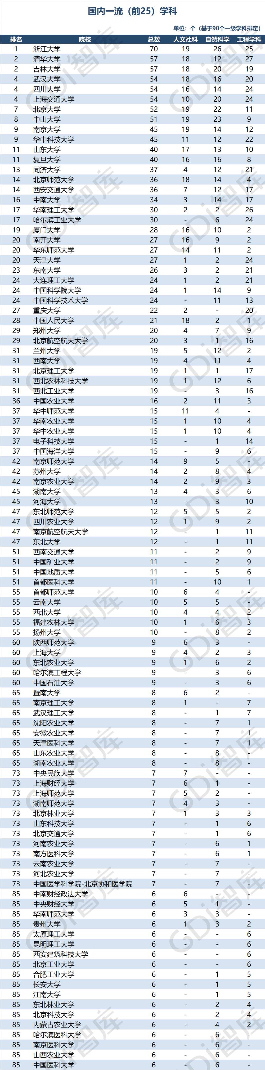 共有36个学科进入全国前25位,进入“国内一流学科”行列,其中包括理论经济学、应用经济学、社会学、马克思主义理论、工商管理、公共管理、图书馆情报与档案管理、数学、物理学、地理物理学、生物学、统计学、基础医学、临床医学、口腔医学、公共卫生与预防医学、中西医结合、药学、护理学、仪器科学与技术、材料科学与工程、电子科学与技术、信息与通信工程、控制科学与工程、计算机科学与技术、建筑学、化学工程与技术、航空宇航科学与技术、生物医学工程、软件工程;共47个学科进入全国前50位,除上述专业外,还有哲学、法学、政治学、教育学、新闻传播学、化学、林学、心理学、光学工程、土木工程、环境科学与工程。