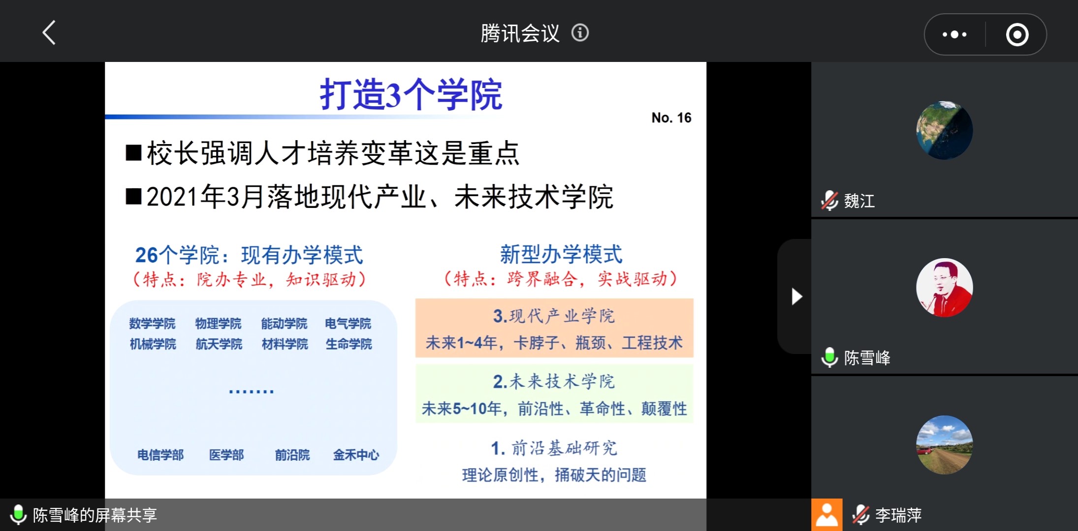 陈雪峰院长阐释了“十四五”规划和2035远景目标的指导思想,强调了面向“两个大局”,强化战略科技力量和科技自立自强的重要性,传达了陕西省政府将中国西部科技创新港作为 “十四五”一号工程,纳入政府工作报告的战略规划,这凸显了其对中国西部科技创新港建设的高度重视。此外,他回顾了自上一轮学科评估以来,在全体教师的奋斗下,学院在大项目、学科排名等方面取得了显著成绩,通过分析学科评估评价指标强调了人才培养的重要性,要多举措深化人才培养模式变革。