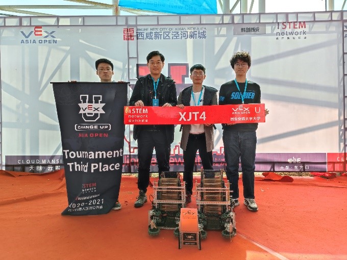 2021年4月2-5日,2020-2021赛季VEX机器人亚洲公开赛在中国西安泾河智慧农业园开幕,XJTU2与XJTU4队参加VEX大学组的比赛,与来自上海交通大学、同济大学、北京信息科技大学、陕西师范大学、华南农业大学等队伍同场竞技,经过激烈角逐, XJTU4队最终斩获联赛季军。