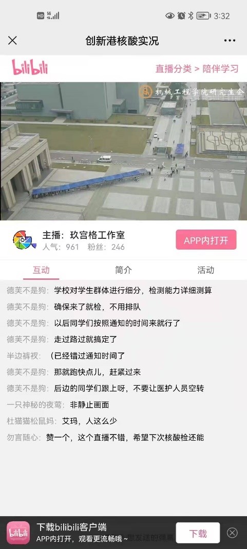 研究生会一直在想如何利用研会力量,减少大家排队时间。这次核酸检测,机械研会玖宫格工作室对核酸检测排队情况进行现场直播,让大家在工位、在实验室、在办公室就能实时观看核酸检测排队情况,进而根据自己的时间和排队人数前往核酸检测点,将往日至少1小时的核酸检测排队时间缩短到10分钟左右,极大提高了学校核酸检测的效率,赢得了学校同学的一致好评。