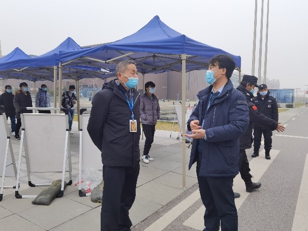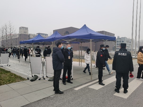 研工队伍不畏寒冷,前往核酸检测排队处督战,指导现场党员先锋队有序引导,保持排队距离,保障检测工作有条不紊、快速推进,于危机中彰显责任与担当。