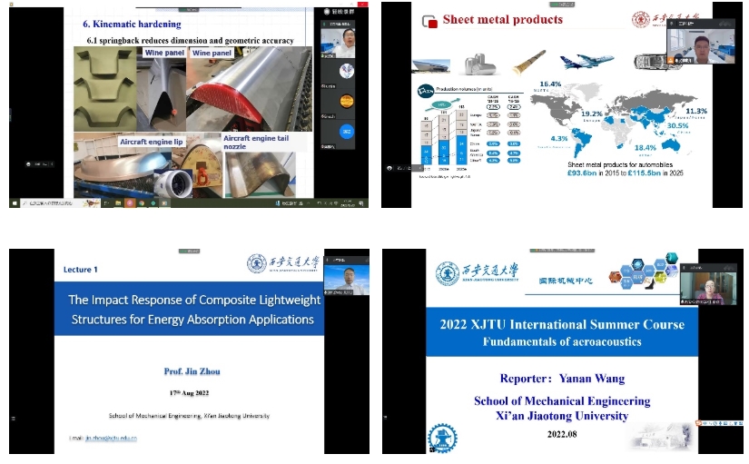 国际机械中心张留洋教授、孙瑜副教授、李培副教授、娄燕山教授、刘啸川助理教授、周晋教授、王亚南助理教授向全球学生讲授了“从不可见到可见的利器-太赫兹波”、“如何模拟多场耦合下的原子尺度行为”、“多孔材料力学行为-从微观到宏观”、“面向成形和产品设计的金属力学性能研究”、“面向工业化应用的轻质复杂薄壁构件先进制造工艺”、“复合材料轻量化结构抗冲击吸能研究”、“气动声学基础理论”相关讲座,通过深入浅出的讲解方式,为全球学生提供了大数据诊断与智能检测领域多维度、前沿性的视角与思考。