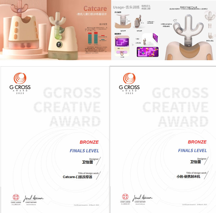 师生在第三届G CROSS设计竞赛中首创佳绩,工业设计专业卫怡蕾同学的作品《Catcare-口肌按摩器》和《小酌-便携制冰机》荣获铜奖,李晓玲和蔺肖曼老师分别荣获优秀指导教师奖。此次赛事中国赛区共有122所院校组织参赛,15226人参赛、共收集27924件作品,通过激烈的角逐,我校突出重围,斩获铜奖两项。