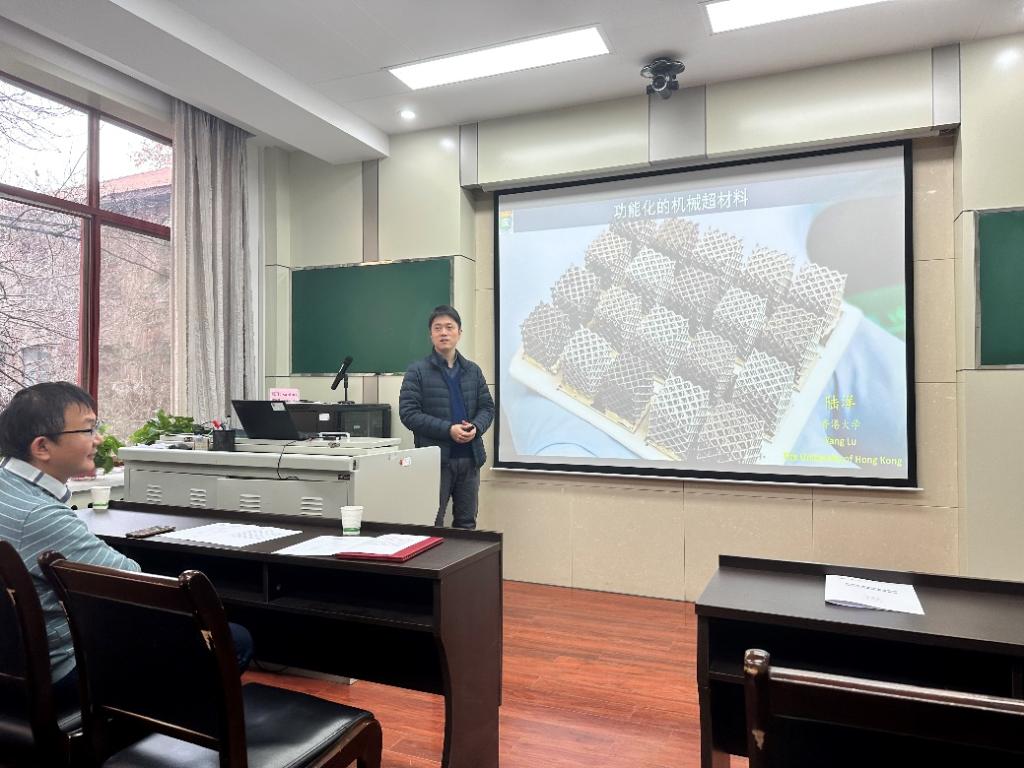 凡正杰副教授主持。陆洋教授结合研究经历,对机械超材料通过其微纳结构的设计来实现对宏观力学性能的调控进行了深入阐释,表明通过对多功能的机械超材料的深入研究,将带动高性能结构设计和先进制造领域新的范式转变,对包括能源和生医工程等领域应用能够提供新的启发。汇报结束后,参加学术讲座的老师与同学针对多功能的机械超材料具体制备工艺方法及工程化应用过程中存在的问题与陆洋教授进行了详细的交流。