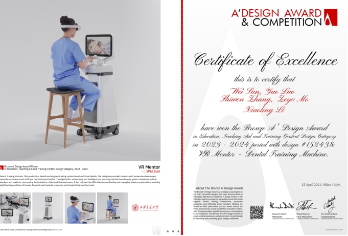 李晓玲教授率领的孙玮、罗瑶、莫泽宇、张诗文研究生团队设计的作品口腔医学虚拟教练《VR Mentor》从全球114个国家/地区的近10250件参赛作品中脱颖而出,斩获铜奖。