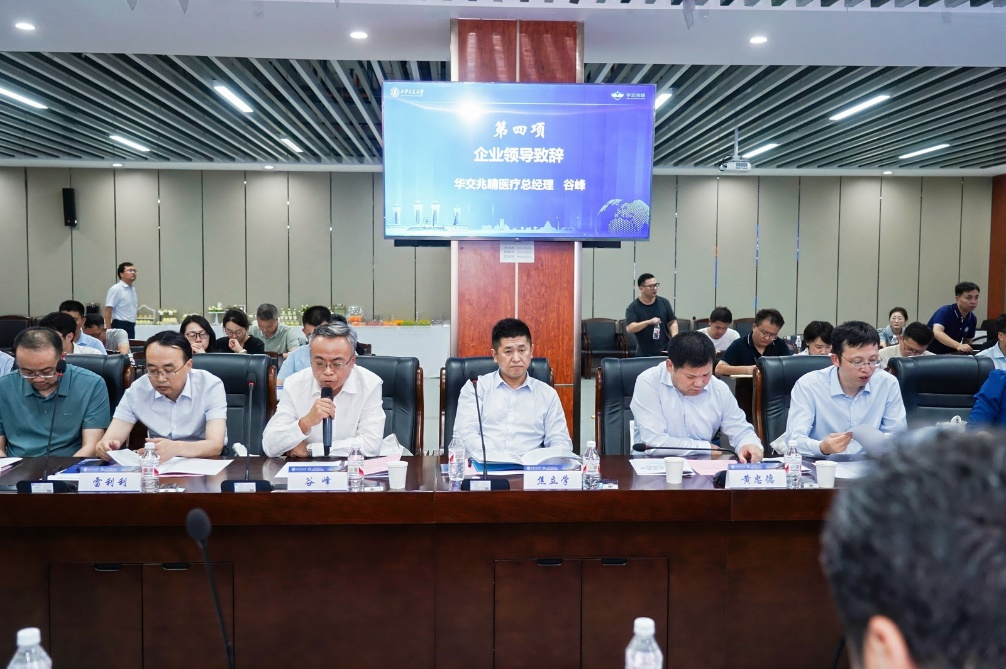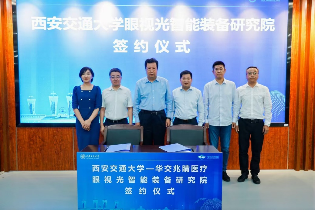 —华交兆睛医疗眼视光智能装备研究院共建协议。蒋庄德、黄忠德、温广瑞、焦立学见证签约仪式。
