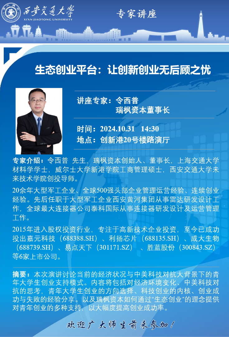 本次演讲讨论当前的经济状况与中美科技对抗大背景下的青年大学生创业支持模式。内容将包括对经济环境变化、中美科技对抗的思考,青年大学生创业的方向选择、科技创业的内核、创业成功与失败的经验分享。以及瑞枫资本如何通过“生态创业”的理念提供对青年创业的多种支持,以大幅度提高创业成功率。
