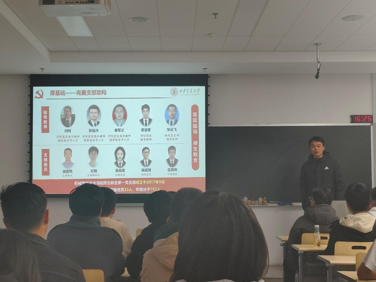 作为活动核心环节,支部共建交流座谈会聚焦思想引领、学术分享与成长赋能。机械一支部书记徐劭玮同志以支部建设为切入点,系统阐述纵向党支部“联系群众、凝聚群众、服务群众”的核心优势,明确“厚基础、树榜样、重实践”的工作主线与“有学问、有理想、有才干”的党员培养目标。通过具体案例展示支部党建活动成效,并号召全体成员胸怀“国之大者”,将西迁精神融入学术科研与成长成才全过程,不忘初心、勇担国家使命,为交大荣誉与学科发展添砖加瓦。