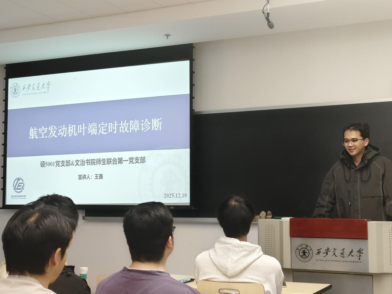 随后,硕5001党支部王鑫同志带来航空发动机叶端定时故障诊断专题分享,从故障诊断的行业价值切入,深入浅出讲解非侵入式应力测试系统(BTT)、多重信号分类法等核心技术,结合数值仿真验证成果,展现前沿科研的魅力与青年学子的学术追求,为在场成员拓宽了学术视野。
