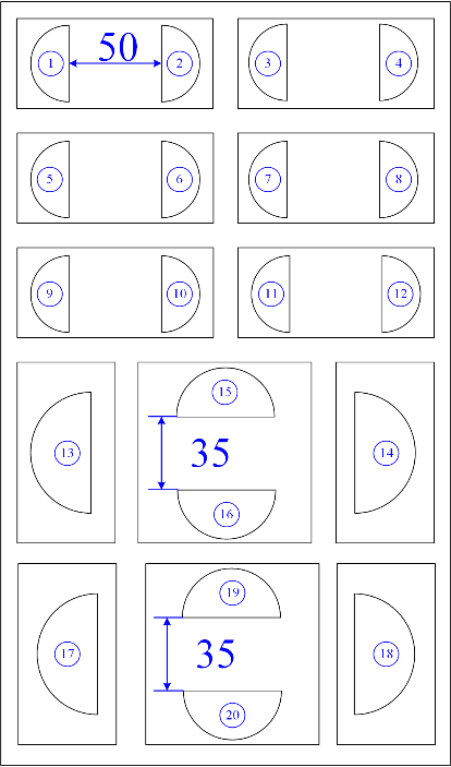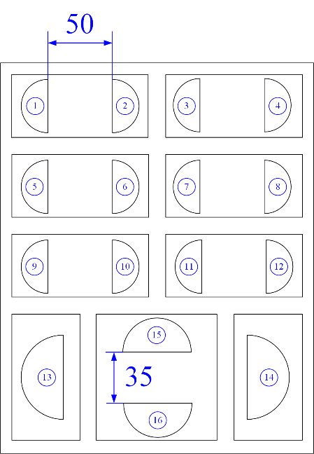 如图2所示为尺寸大小为1200mm×1200mm×50mm的吸声超结构样件的1/20示意图。将图2(a)所示的结构在水平方向周期排列5块,并在竖直方向周期排列4块即可组成1200mm×1200mm×50mm的吸声大样件,如图2(c)所示。图2(b)为质量块的排列方式及间距。图中质量块在位置上均采取对称方式进行布放,对13、14号质量块,其摆放位置均位于薄板的中心。(Φ206吸声超结构500mm样件按此设计进行加工)