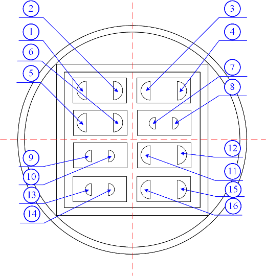 图1所示为直径206mm厚度为50mm的吸声超结构示意图。图1(a)为超结构框架尺寸图,从框架图中可以看出该超结构由8个包含聚氨酯背腔的薄板质量吸声单元组成。超结构的外部圆形框架的厚度为8mm,中间矩形框架的上下侧壁厚度为10mm,左右侧壁的厚度为8mm,其他壁厚均为10mm。薄板的尺寸为65mm×24mm×0.4mm,材质为不锈钢。图1(b)为超结构质量块分布示意图,质量块按从上到下,从左到右的顺序依次记为1-16号,两两质量块间的间距为2倍质量块半径,质量块的材质均为铅块,具体的尺寸如表1所示。