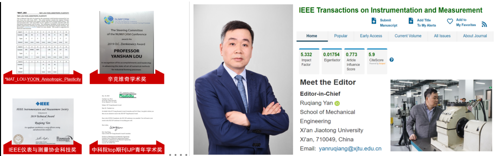中心娄燕山教授提出的屈服方程和失效准则被美国有限元软件LS-DYNA采用并命名(MAT_LOU_YOON),获Zienkiewicz奖(美国,2019)和权威期刊Int. J. Plasticity青年学术奖(2020);中心主任严如强教授为《IEEE仪器与测量学报》期刊创刊以来首位担任主编的中国学者,并获得2019 IEEE仪表与测量协会科技奖,用于表彰其在智能传感和先进数据分析领域的突出贡献。