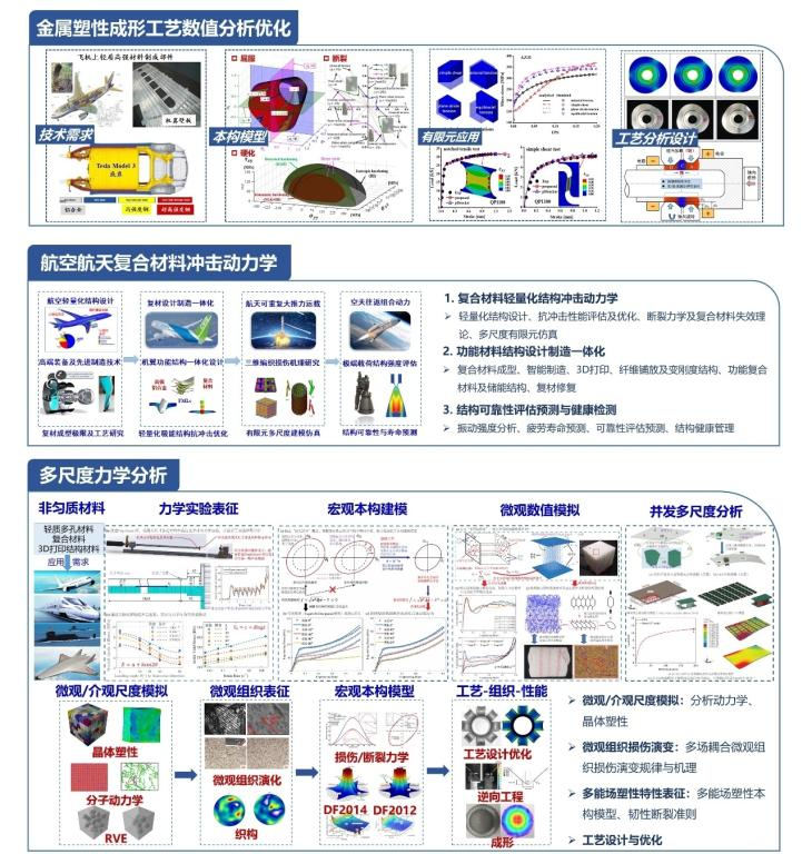 1.材料结构功能一体化:金属塑性成形工艺数值分析优化、航空航天复合材料冲击动力学、多尺度力学分析等;