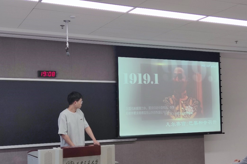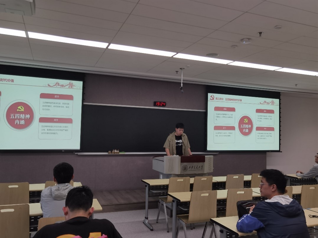 本次会议由支部成员魏世招同志和何佳鹏同志组织。会议包括“回顾五四运动历史”、“五四运动的历史意义”、“五四精神的时代价值”、“新时代传承弘扬五四精神”四个部分。1919年5月4日下午1时,由于巴黎和谈失败,北京学生3000余人汇集天安门,举行大规模游行。然而,五四运动,要从鸦片战争说起,一直到新中国成立才结束。魏世招同志围绕“回顾五四运动历史”这一主题带领支部成员深刻了解五四运动的始末。