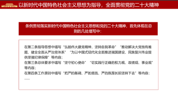 胡子睿同志首先着重强调了《中国共产党纪律处分条例》党的二十大后再次修订,是贯彻落实新时代中国特色社会主义思想和党的二十大精神的必然要求,是将党章要求具体化为纪律规定的实际行动,也是实现和其他党内法规、国家法律相衔接的生动体现。其中通过举例说明增写“坚守初心使命;增写“把严的基调、严的措施、严的氛围长期坚持下去”等内容,使得支部同志们对新时代中国特色社会主义思想和党的二十大精神有了更加深刻的认识。