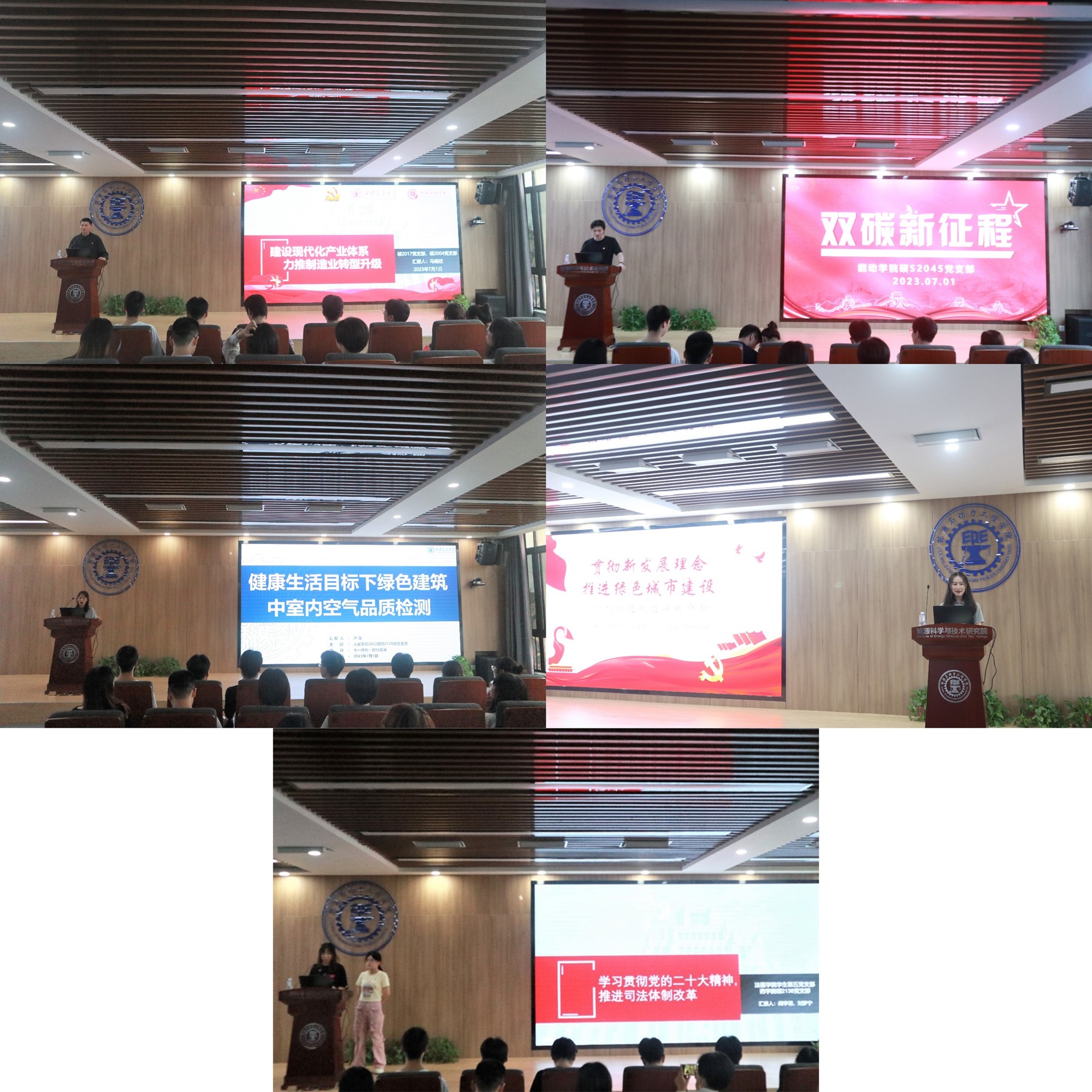 七号楼中太阳能光伏装置与毛细空调的建筑设计,聚焦双碳课题,凝练出绿色建筑中环保材料应用的关键要素,提出了以二十大精神内涵为“核心”,以建筑设计、建筑材料创新为“助力器”,践行生态环保理念,促进学科交叉融合,推动双碳工作落地。医学部法医学院学生第五党支部的阎亭羽同志和药学院硕2135党支部的刘梦宁同志从司法体制改革含义、新时代司法体制改革的丰硕成果、党的二十大对司法体制改革的新要求等方面对党的二十大报告中关于司法体制改革的内容进行了介绍和解读。