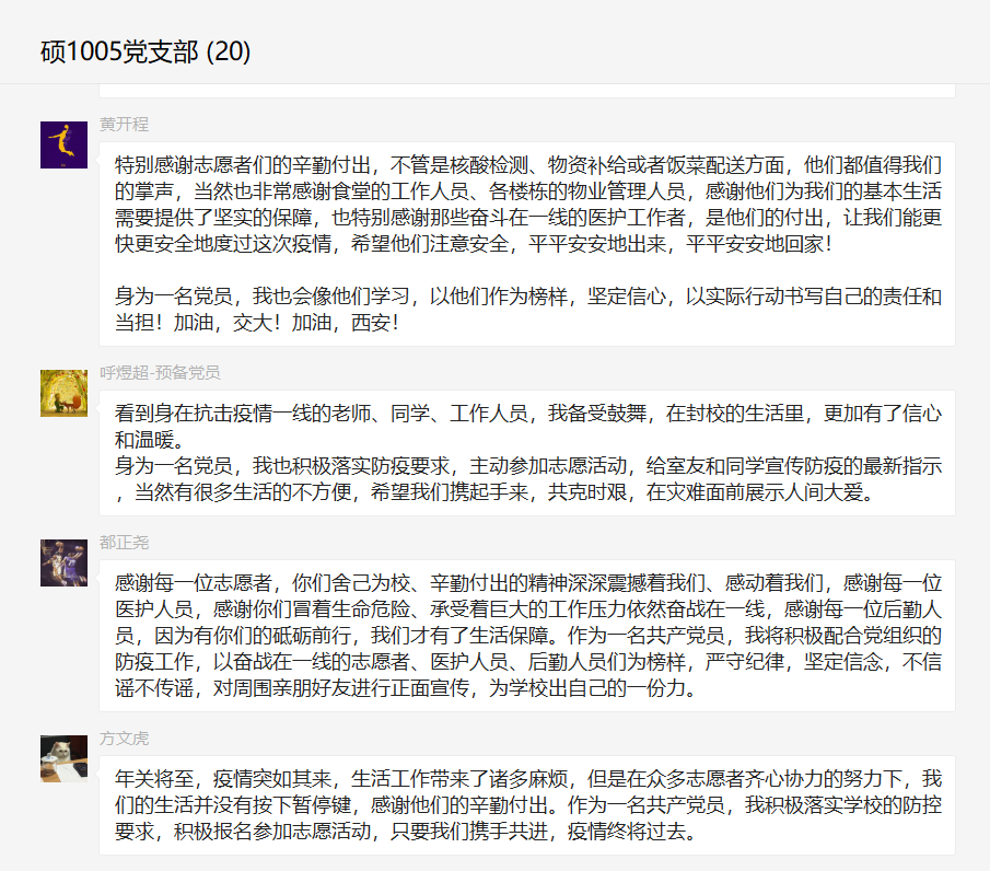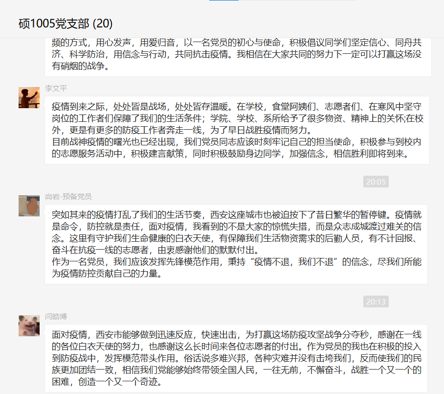 为致敬抗疫中奋战一线可爱可敬的无名英雄,发扬我校学子“饮水思源”的优良传统,硕1005党支部于2022年1月6日19:00在线上召开了“感恩抗疫中的无名英雄”组织生活会。旨在分享本次抗疫行动中发生的暖心故事,并去深刻认识作为青年学子在懂得感恩的同时也应当扛起责任和使命。