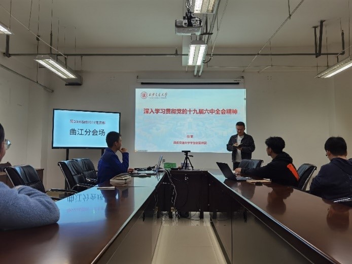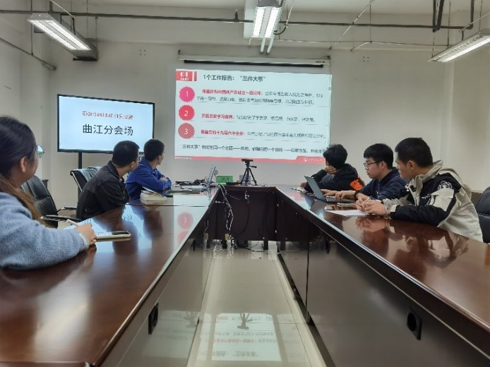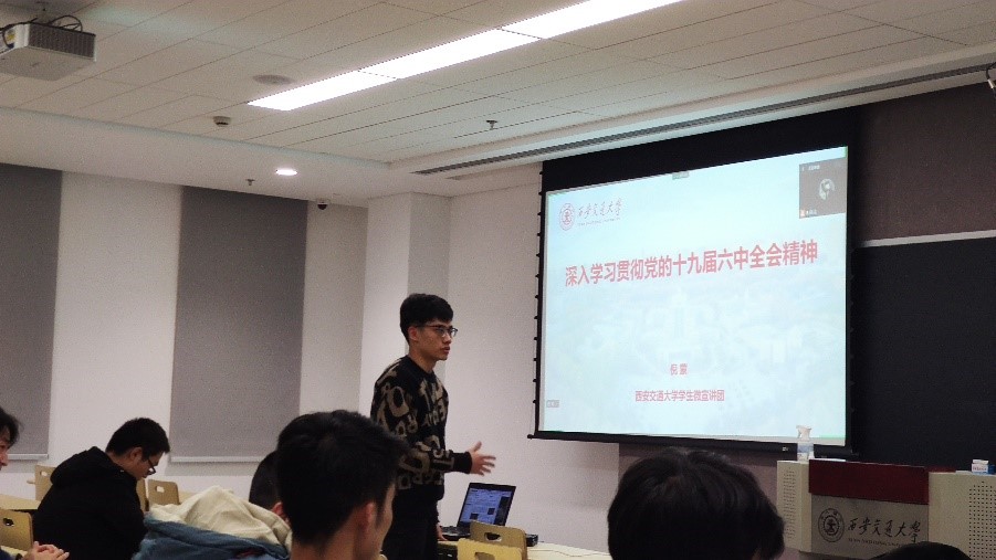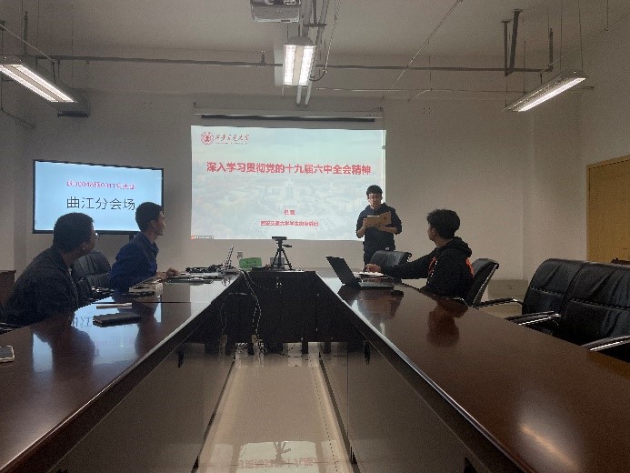 学生微宣讲团团长倪蒙开展党的十九届六中全会精神宣讲活动。本次宣讲活动设创新港主会场和曲江分会场。