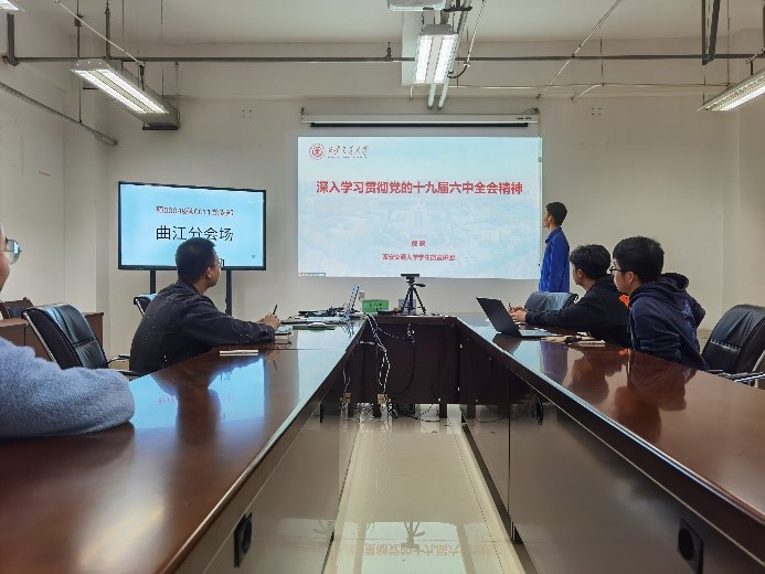 硕0004党支部书记薛成同学以全会公报中“勿忘昨天的苦难辉煌,无愧今天的使命担当,不负明天的伟大梦想”三句话分享学习心得。他指出,一是勿忘昨天的苦难辉煌。党诞生于国家内忧外患、民族危难之时,百年来我们党大力弘扬伟大建党精神,领导人民取得了一系列历史性成就,我们要认识到从苦难到辉煌的伟大转折,要从历史中汲取经验教训。二是无愧今天的使命担当。中国共产党人的初心和使命始终激励着我们敢于担当、善于担当。当前,百年变局叠加世纪疫情,世界进入动荡变革期。我们党坚持人民至上、生命至上,打赢了疫情防控阻击战和脱贫攻坚战,如期全面建成小康社会。三是不负明天的伟大梦想。在党成立一百周年的重要历史时刻,我们顺利实现第一个百年奋斗目标,正在踏上全面建成社会主义现代化强国的新征程,仍然要付出更为艰苦的努力。我们要以“两个确立”统一思想行动,在新时代的赶考路上努力交出优异的答卷。